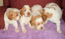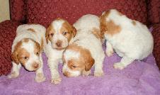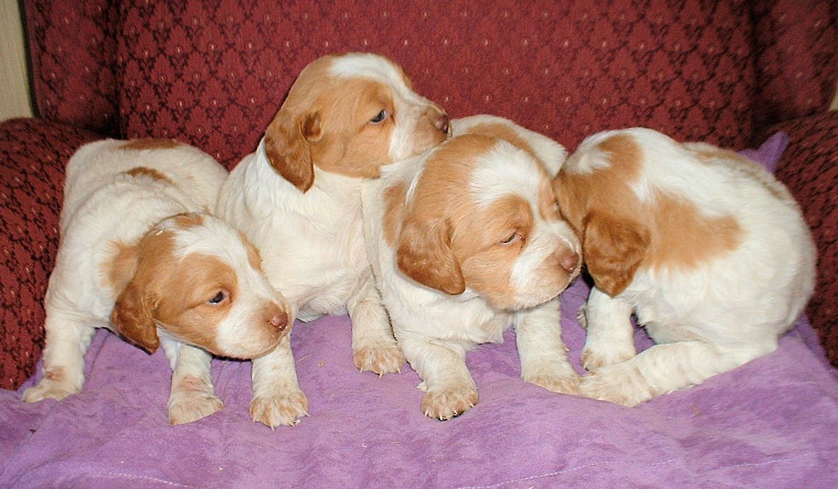 | About Brittany's History The name "Brittany" is taken from a region in northwestern France. Images of Brittanys were first seen on tapestries and paintings from the 17th century. These images depicted orange and white dogs hunting and retrieving game. The first written and verifiable record of Brittanys comes from a hunting description written by Reverend Davies in 1850. Davies described hunting with small "bobtailed" dogs who were pointed and were excellent retrievers. It was around the same time that the modern Brittany is rumored to have been bred by mating 2 types of English sporting dogs. The Brittany was first recognized as a breed in 1907 when an orange and white male named "Boy" was registered in France. As a result, the first standards were outlined in the same year. America first recognized the Brittany in 1931 and the breed was approved by the American Kennel Club in 1934. In 1982 the "Spaniel" was officially dropped from the name and the breed became simply known as "Brittany." Appearance A Brittany is typically quite athletic, compact, and solidly built without being heavy. Other characteristics include long legs, and their expressions are usually of intelligence, vigour, and alertness. Their gait is elastic, long, and free. Some Brittanys are born with naturally short tails and others with long tails. If born with a long tail it is normally docked to a length of 3 to 10 centimetres (1 to 4 inches). Brittanys come in a variety of colours, where an orange and white coat or liver and white are most common in the American Brittany; other colours include orange roan and liver roan, all of which are acceptable in the show ring. The American Brittany Standard does specify an acceptable tri-colour of liver, orange, and white with very specific color placement which is also acceptable in the show ring. Size Brittanys should range in a height of 17 inches to 20.5 inches at the withers (17.5 to 20.5 in America), with females at the lower end and males taller. A properly constructed and healthy Brittany maintains a weight between 36 and 43 lb (16 to 19 kg), depending upon height. North American field lines tend to be larger, with many dogs reaching a healthy weight of 45 to 50 lb (20 to 23 kg). Temperament The breed was originally bred as a hunting dog and noted for being easy to train and sweet-natured. The breed is generally more sensitive to correction than other hunting breeds, and harsh corrections are often unnecessary. Brittanys are all around sound dogs, as they are excellent family pets as well as working dogs in the field. The dogs are active and require frequent exercise and room to run, and a fenced yard is essential. At least one long walk is required daily to satisfy the needs of most Brittanys, and many Brittanys will need more than this. The breed sometimes gets a reputation for being crazy or uncontrollable, but these problems are almost invariably due to lack of exercise and training, and are not commonly seen in well cared-for dogs. Brittanys can become very shy if not thoroughly socialized, and even among well-socialized dogs there is significant variation in levels of friendliness. With more American dual champions (dogs with titles in both conformation shows and field trials) than any other breed, the Brittany maintains strong hunting instincts in all bloodlines. |